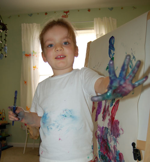 Actually I was feeling quite lousy this afternoon but I can never feel bad when I have such an amazing little girl to brighten my day. Today K and I were talking about Uncle S and how his birthday is coming up. I was mentioning that he is an artist so K decided she wanted to paint a picture for him. I put on some music (woot, Queen!) and she got to work. It started out innocently enough and then she decided finger painting would be more fun. Well, I wasn't going to be out done so I started painting her hands so she could do hand prints. Then we just resorted to smearing her hand on the paint palette to finally just letting her wipe her hands on her shirt. I remember when I used to be *that* Mom that would get an eye twitch if my kiddo got a speck of dirt on her. I'm SO glad I gave up that persona because today was way too much fun =D